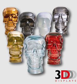 3D Displays reveal new range of glass skulls 3D Displays are excited to announce the arrival of a stunning addition to their range. The glass head is one of our most successful products and is now complemented by a range of stylish skulls, clear and coloured. Made from recycled glass they are available in a vibrant range of colours - Black, Bronze, Clear, Gold, Red, Silver & White. Ideal as a quirky addition to a range of retail environments. Perfect for hats or headphones or simply as a bookend or decorative item to enhance a display and focus attention. For a retail display that is just that little bit different visit www.3ddisplays.co.uk Contact: |