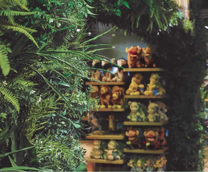 with The Lion King soft toys, merchandise and gifts with grasses growing underneath fittings and leaves above fixtures also contributing to the immersive shopping experience, look and feel. A delightful shopping
