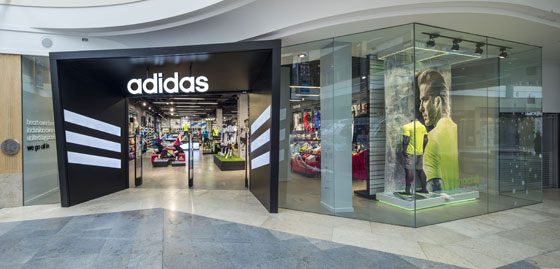 Slatwall lines the perimeter walls on all three sides of the store and becomes the very essence of the brand - customised to convey the Adidas experience. Throughout the shop floor fixtures and fittings, hanging rails, display busts and mannequins, together with mirrors, large graphics and feature displays are grouped together to define each sporting activity. In football, at the front of the store, three mannequins displayed on a grass topped plinth are kitted out in the latest football strip. Each footballer is either mid-run or mid-kick with the ball at his feet (or on his knee!). Behind this display feature, clothes and merchandise are neatly arranged on a variety of fixtures and fittings that allow customers to find their desired item quickly and easily. There is plenty of space to browse. Other sports follow suit and lead you naturally through the store and into the central hub, where the Adidas Shoebase is located.