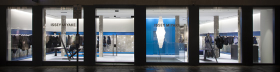 As you would expect, this flagship is spacious and the merchandising is minimal. The presence of black anodised ‘in-house’ designed display tables are as much a part of the overall ambience as the items on sale. Considering their size, the tables display very few items – three tops are artfully arranged, curled around having the appearance of new buds uncurling in May. Light features are equally fabulous. All designed ‘in-house’, they take on an ethereal quality, somewhere in between nature and design as they emit a diffused, warm glow into the harsh and contrasting space. Stunning concrete pillars, which stand proud within this delectable interior, create yet another remarkable statement. Rather than try to conceal them, the designer has applied plaster roughly and left them unfinished. They are distinctive, yet at the same time at odds with the immaculately orderly store – a direct reference to Miyake himself and his eccentric label. As in so many stores nowadays the staircase is a feature in itself and this store does not disappoint; the formidable, concrete, steel and glass structure seems to literally drop away through a cavernous hole. Functional in form, yet without doubt considered and intentional; the staircase is quite magnificent in its descent.