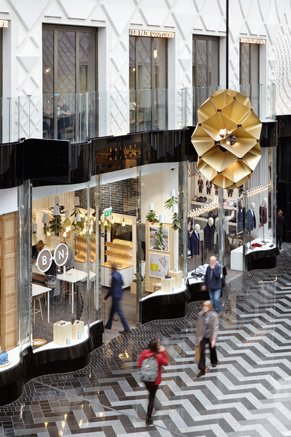 The arcade is highly spacious and opulent. Elegant, curved glass shop fronts line the avenues, echoing their Victorian predecessors. The storefronts are streamlined all having gloss black headers and footers plus refined, gold lettering as signage – very tasteful indeed. The stone floor is yet another significant feature, created from 15 shades of sparkling grey tiles arranged in a herringbone pattern and pays homage to the textile heritage of this area.