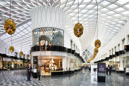 Inside the new centre it is even more flamboyant! It’s a thoroughly twenty-first century take on the splendour and grandeur of the Victorian arcades and the great, nineteenth century European shopping malls. The gigantic glass and steel roof above is just as detailed as the three dimensional exterior patterns and assumes a similar style. It rises and falls above the shops and forms a large, spacious canopy set a whopping 22 metres above the square, at the entrance to John Lewis. As such the entire complex is flooded with natural daylight giving a feeling of openness that is quite unique in an enclosed shopping centre. A string of ornate pendant lanterns are suspended from the intricate roof. An art form themselves, they are created from gold coloured metal welded together to form an open flower. The lanterns add a touch of glamour to the bold, architectural roof.