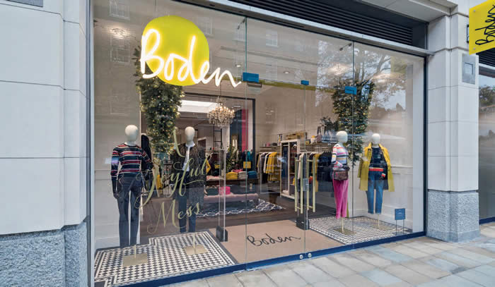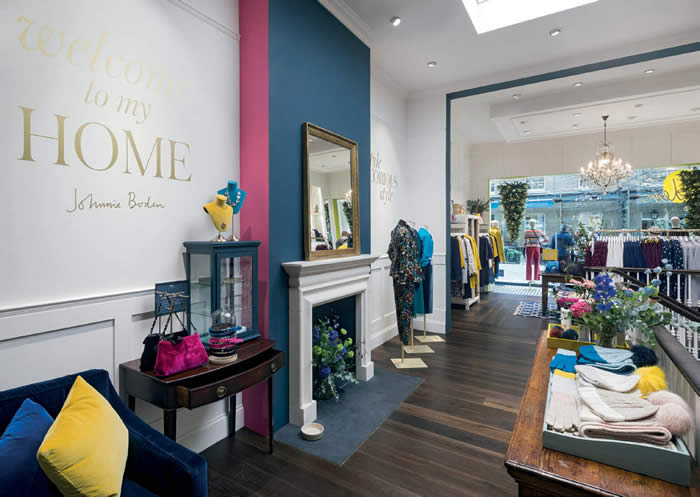 Within the centre of the store a few mannequins showcase particular outfits, otherwise it has the look and feel of a grand hallway complete with a sofa, large ottoman footstool, a couple of side tables, a glass display cabinet and ornate mirror over the fireplace. On all the display tables and chairs are found objects to infuse an authentic homely feel. The chimney breast and opposite wall are painted in a denim blue often associated with Boden and create a bold backdrop for the store, complimenting the dark oak floor and contrasting with the white walls and ceiling. The hallway leads to the equally grand
