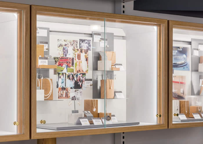 display case edged with light oak runs the