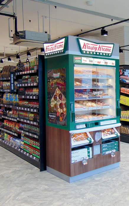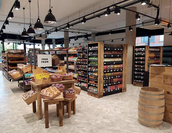 Royal Holloway Student Union, London The second grocery retailer on our travels is located in Egham, Surrey. This fabulous new food hall is sited within the state of the art library complex that now graces an historic university campus. Made from copper panelling and glazing, the new building is also eco friendly, as is the new Royal Holloway Student Union Shop. The designers, Retail Design Solutions Ltd, were tasked with a complex brief to create a unified and cutting edge interior that would also stock a very broad selection of produce, everything from Krispy Kreme doughnuts (the modern student’s favourite snack) to clothing. They had to develop a concept that was easy to navigate and stocked all the essentials, but looked incredible and would be a pleasure to shop.