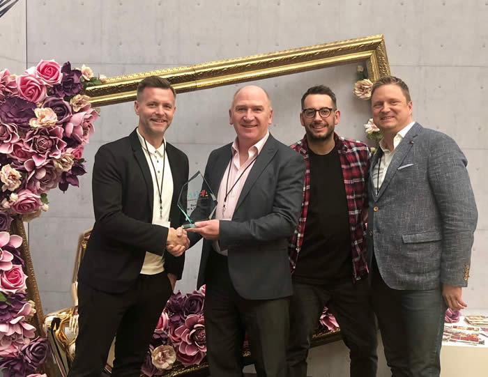 SDEA President, Angus Morton (of B Brown Display Materials) presenting the award on the Barthelmess stand during The VM & Display Show: